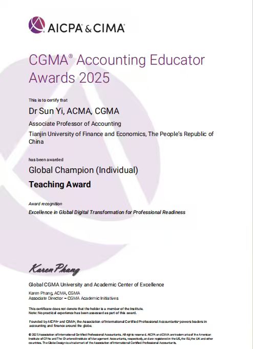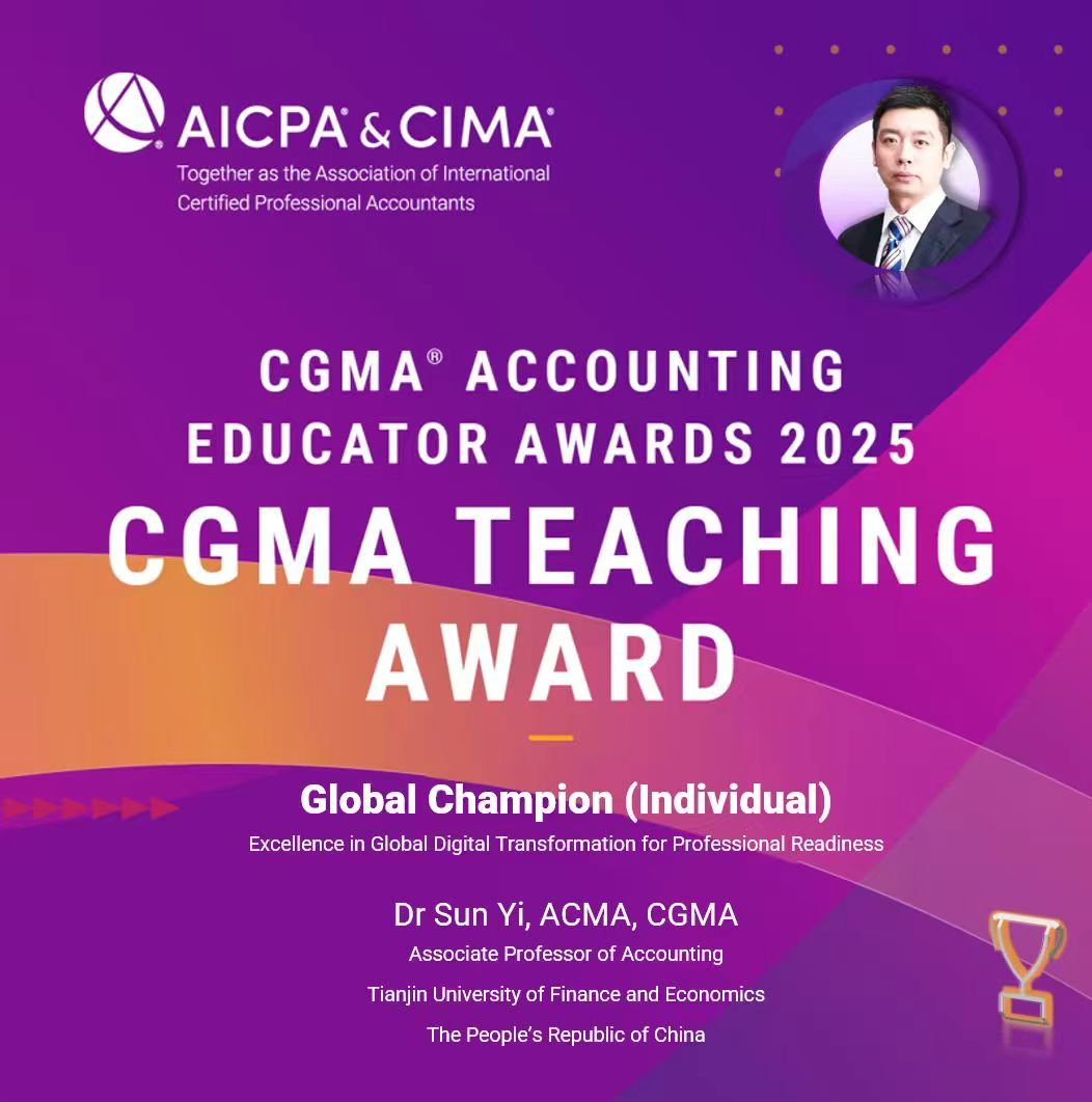 近日,AICPA&CIMA国际注册专业会计师公会于线上举办2025年度CGMA会计教育者奖(CGMA Accounting Educator Award 2025)颁奖典礼并揭晓获奖者名单。我院副院长、副教授孙毅荣膺2025年度CGMA会计教育者教学奖项(CGMATeaching Award)个人组全球冠军。