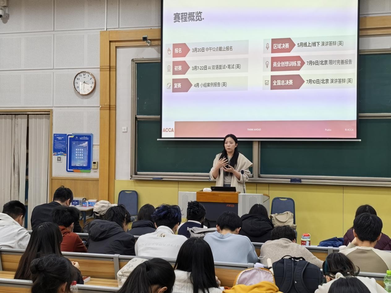 ACCA(特许公认会计师公会)北京代表处教育及学员发展主任张译丹以“塑造未来商业伙伴”为主题,首先聚焦2026年ACCA全国就业力X未来商业创想大赛(JHC)赛事,系统介绍赛制流程、细致梳理核心备赛要点,结合赛事价值鼓励同学们以赛促学,依托实战竞技平台全面提升商业分析能力与团队协作素养。随后,她详细讲解新版ACCA专业资格课程体系、关键节点进度,精准分析过渡期对不同届别学生的影响,全面介绍公会提供的专属核心教学资源与配套支持举措,为师生提前制定规划、从容应对过渡阶段各项事宜提供了清晰指引。