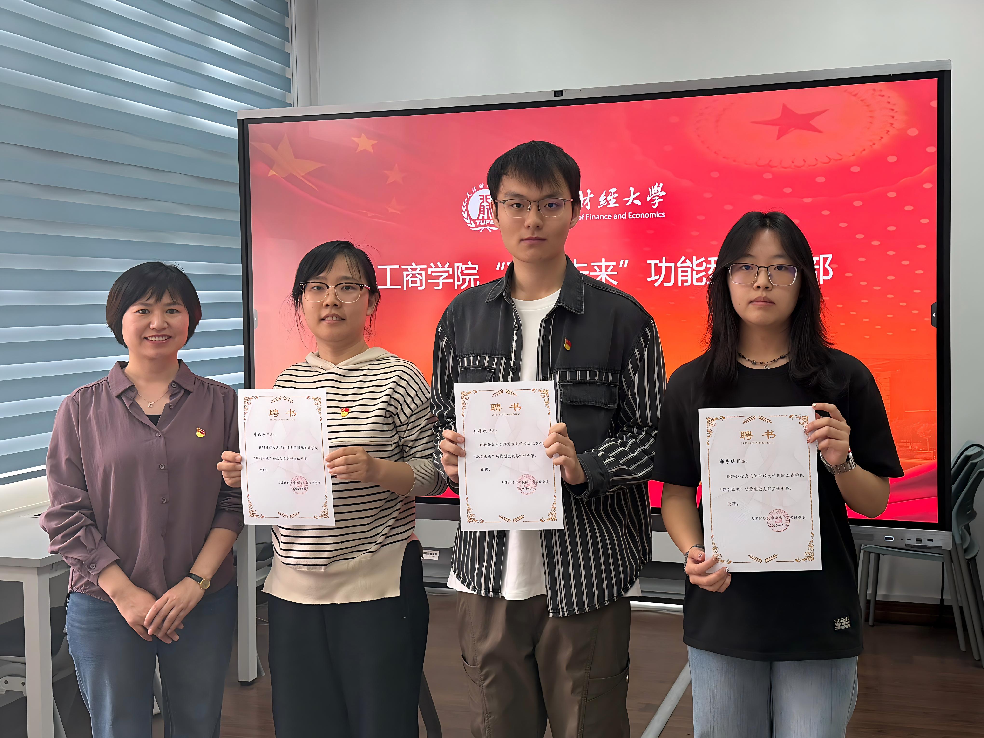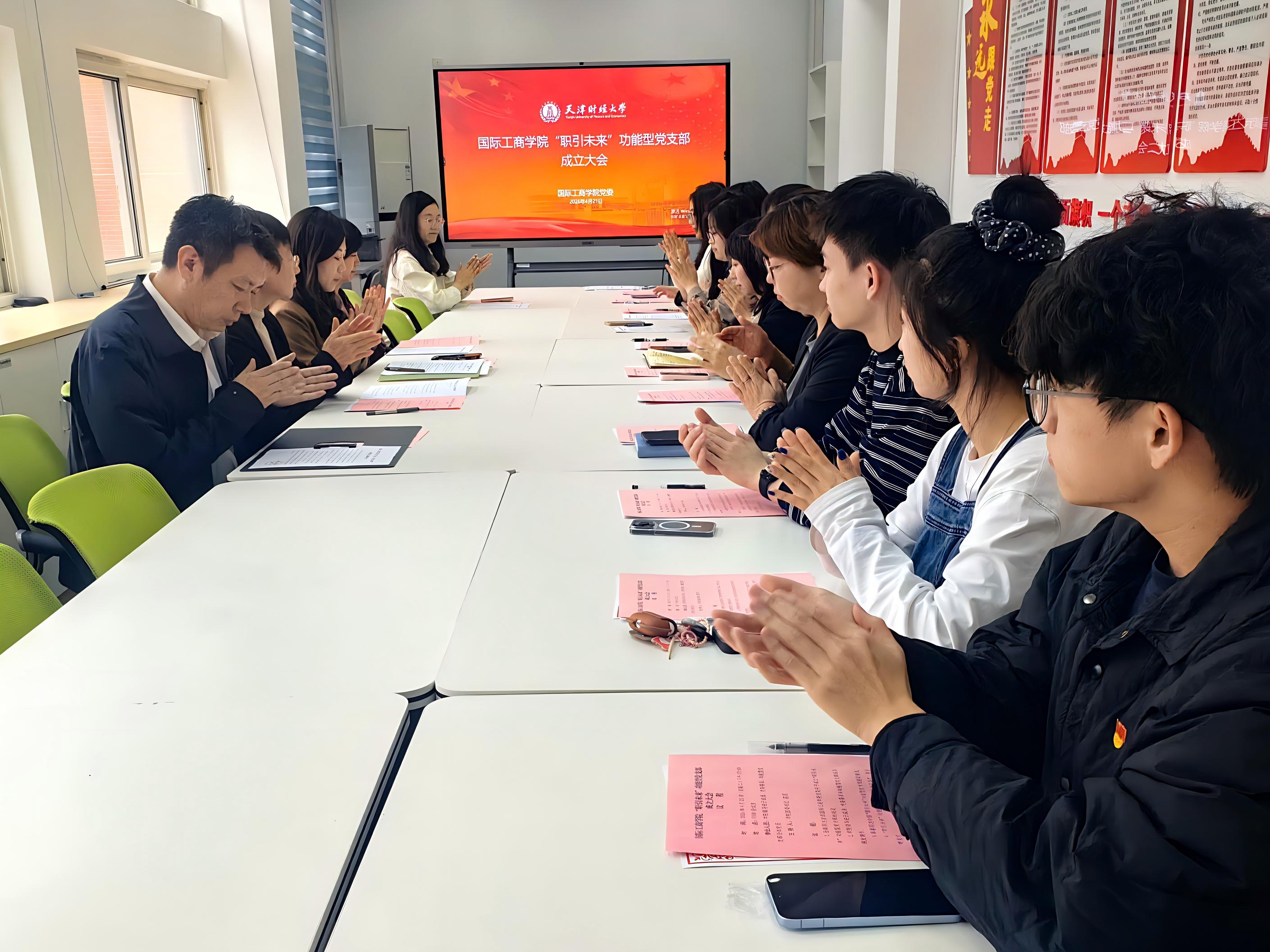 为深入贯彻落实新时代党的建设总要求,推动基层党建与育人事业深度融合,2026年4月21日下午,国际工商学院“职引未来”功能型党支部成立大会在F308会议室隆重举行。学院党委书记王欣,副书记、纪委书记郭睿,副院长孙毅,党委委员、办公室主任李慧媛及功能型党支部全体师生党员参加会议。会议由学院学生党支部书记范思主持。